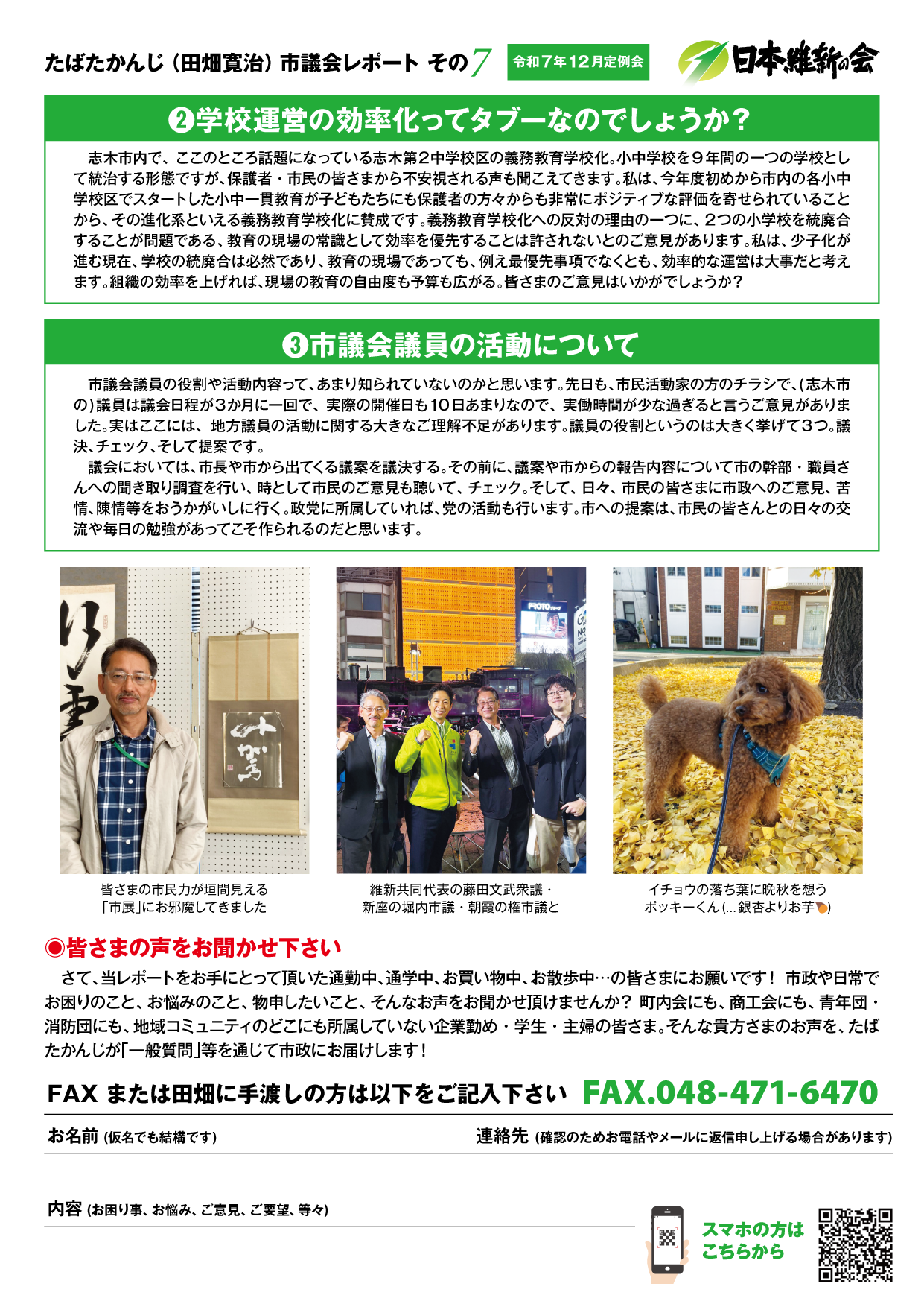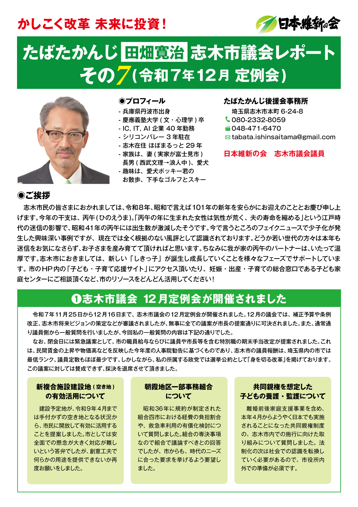 「たばたかんじ(田畑寛治)志木市議会レポートその7」を掲載いたしました。以下のトピックを中心とした内容となっております。